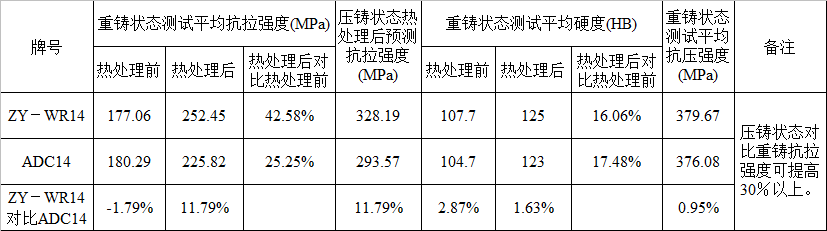本司新开发的ZY-WR14耐磨铝合金,具有良好的耐磨性能和切削加工性能。主要可应用于发动机零件、自动和手动变速器零件、动力转向液压泵零件、空调压缩机零件等。其耐磨性能和主要力学性能均优于所生产的ADC14。以下是ZY-WR14与ADC14几项主要指标在铝锭重铸状态下测试数据的平均值对比。