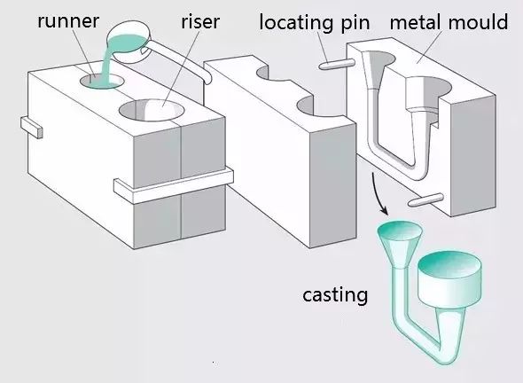 金属型铸造:指液态金属在重力作用下充填金属铸型并在型中冷却凝固而获得铸件的一种成型方法。